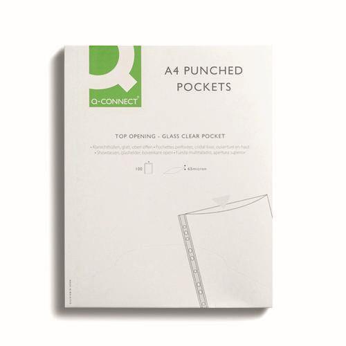 Great for presentations, displays and general filing, these durable and versatile Q-Connect punched pockets are A4 size and multi-punched for use in standard ring binders or lever arch files. The glass clear 65 micron pockets are also top opening for quick and easy access to documents. This pack contains 100 punched pockets.
